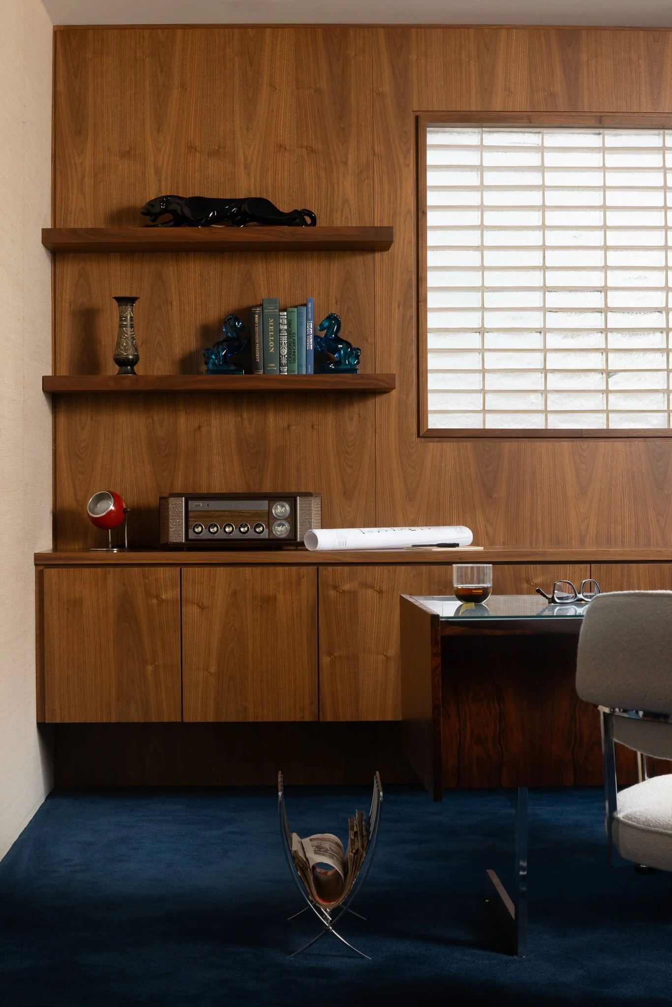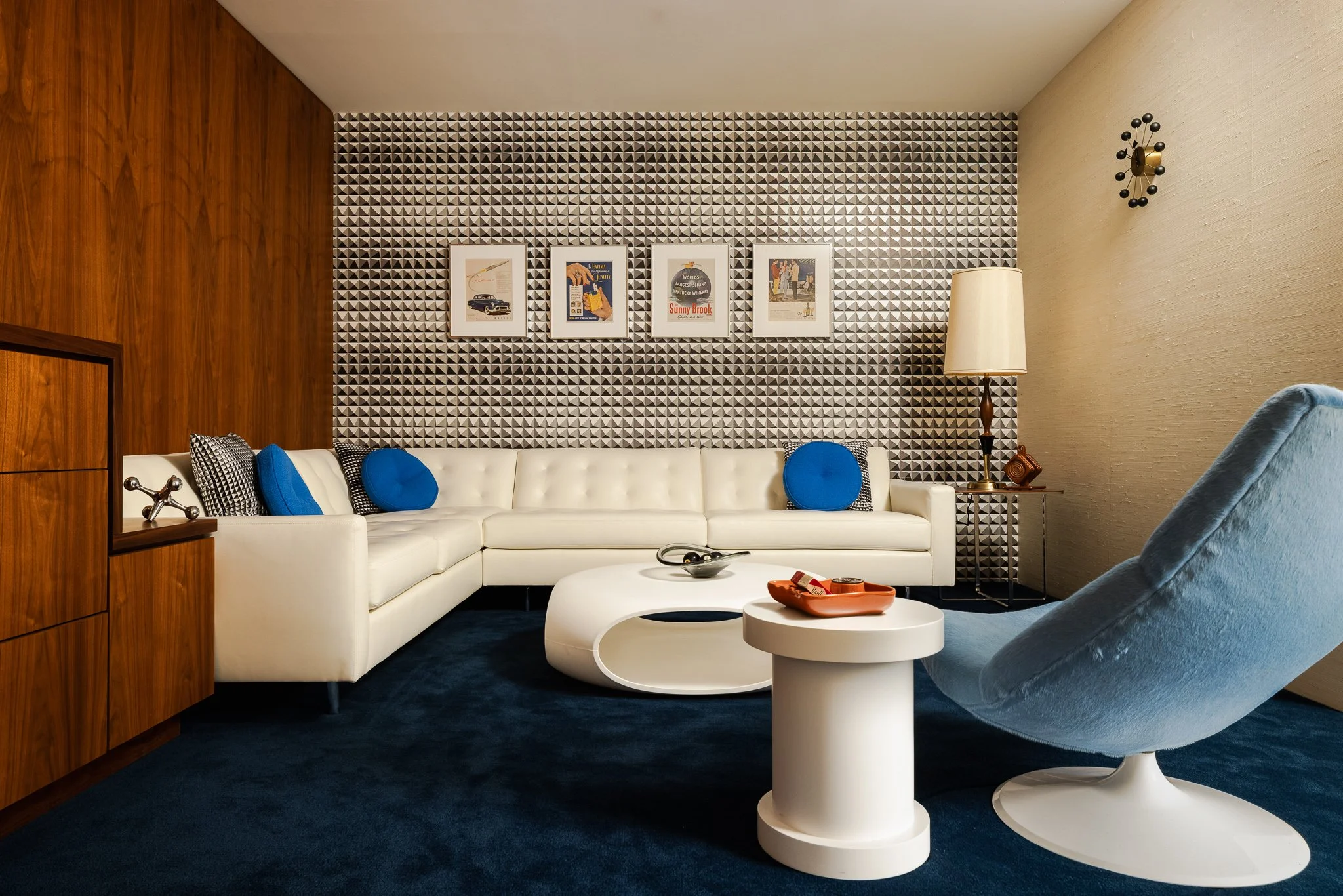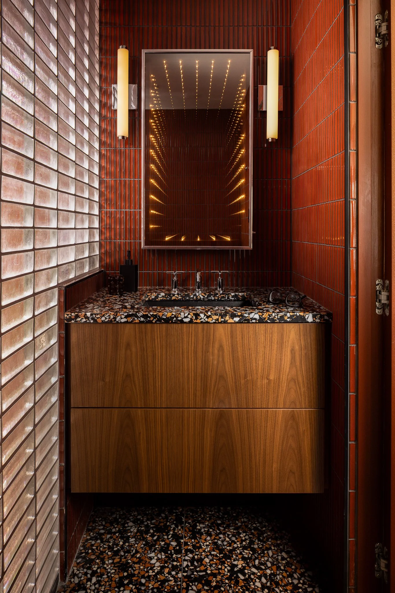 The resulting design draws inspiration from a Mad Men–era Mid-Century Modern aesthetic with a Space-Age twist, featuring restored period furnishings, custom walnut cabinetry by a local craftsman, and layered textures throughout. In the bath, curved partitions, mosaic tile, custom terrazzo, and a restored MCM infinity mirror create a striking, immersive experience that completes the transformation.