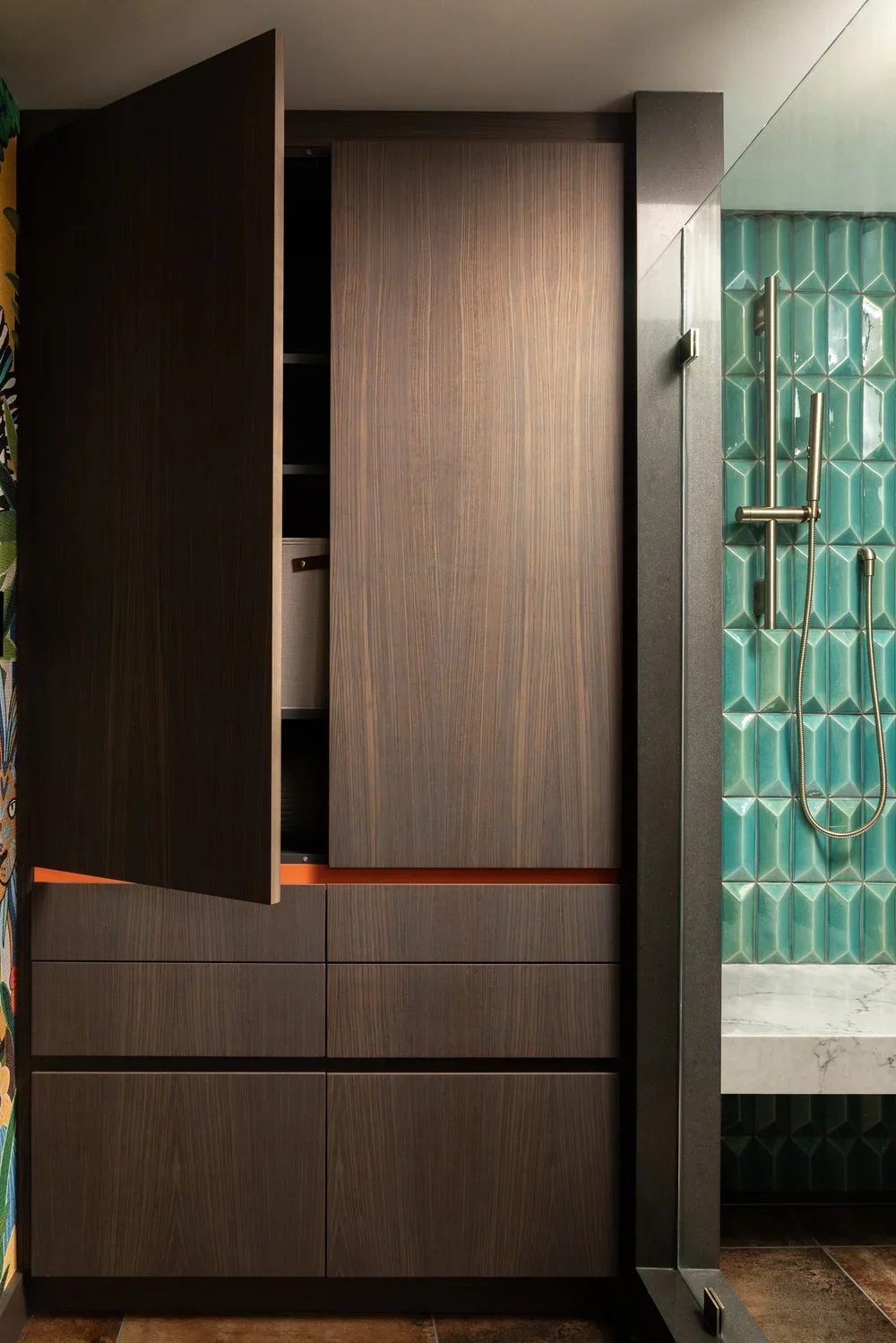Rowhomes demand storage, but stacking cabinets to the ceiling without intention can quickly make a space feel heavy, especially in kitchens and primary suites. The J.THOM solution includes thoughtful vertical storage strategies, including furniture-style tall units and concealed pantries that provide exceptional function without overwhelming the room.
