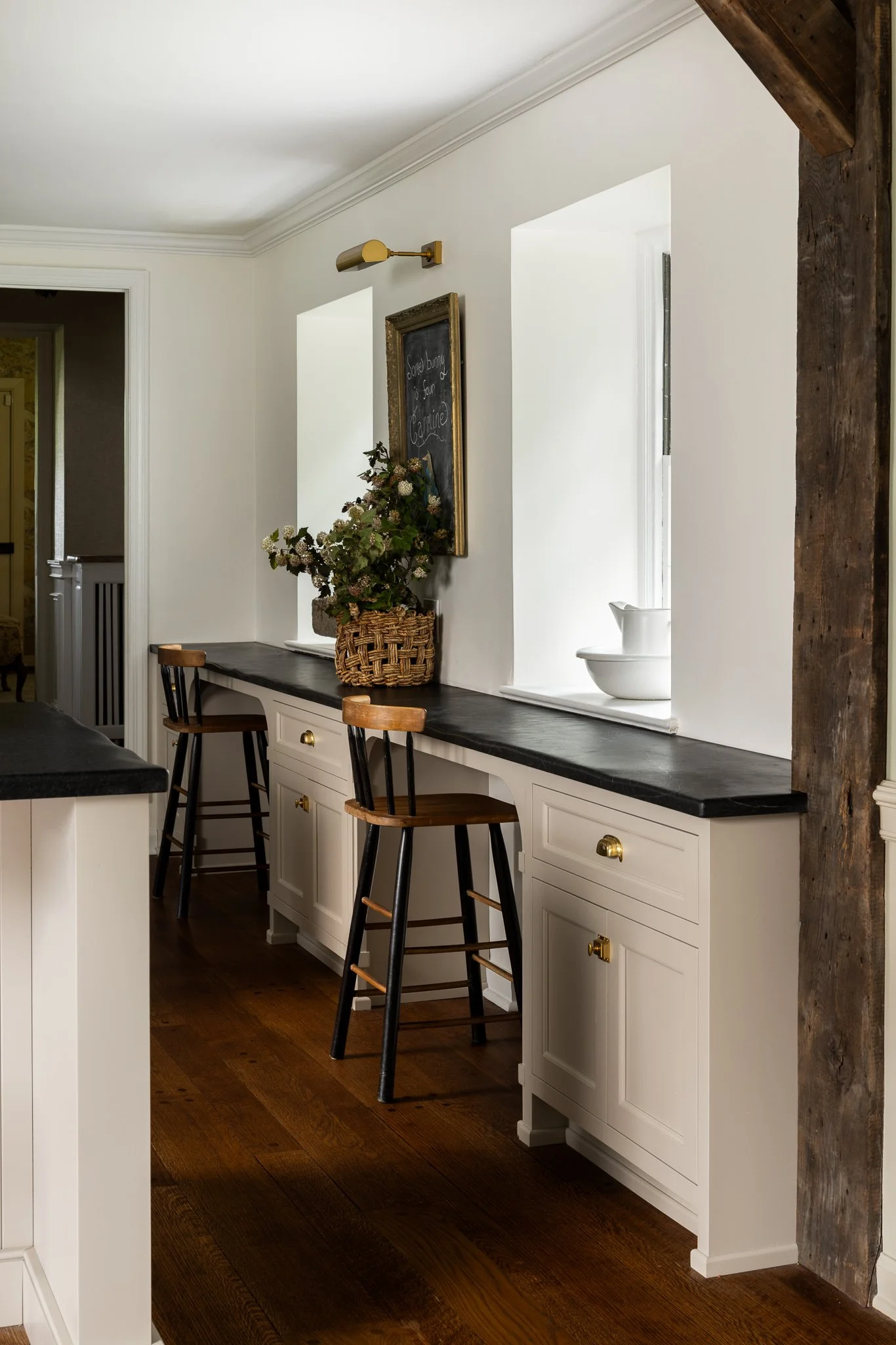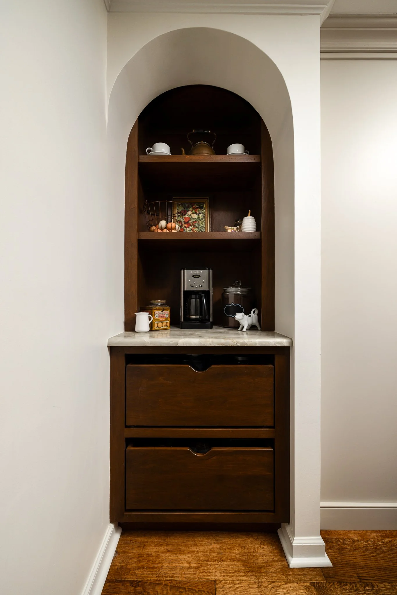 Cozy built-in workspaces, flooded with natural light, offer the perfect spot for browsing recipes or enjoying a morning coffee. Just around the corner, the arched nook invites morning refills or an afternoon espresso.